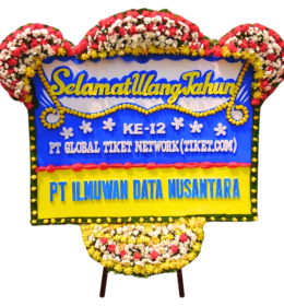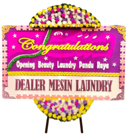 - Penataan: Bunga disusun di atas papan dengan desain yang tertata rapi dilengkapi tulisan ucapan.