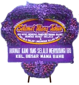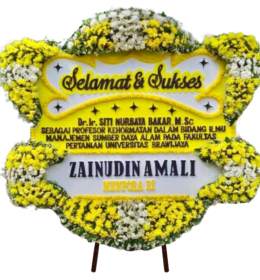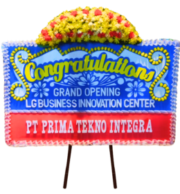 - Penataan: Bunga disusun di atas papan dengan desain yang tertata rapi dilengkapi tulisan ucapan.